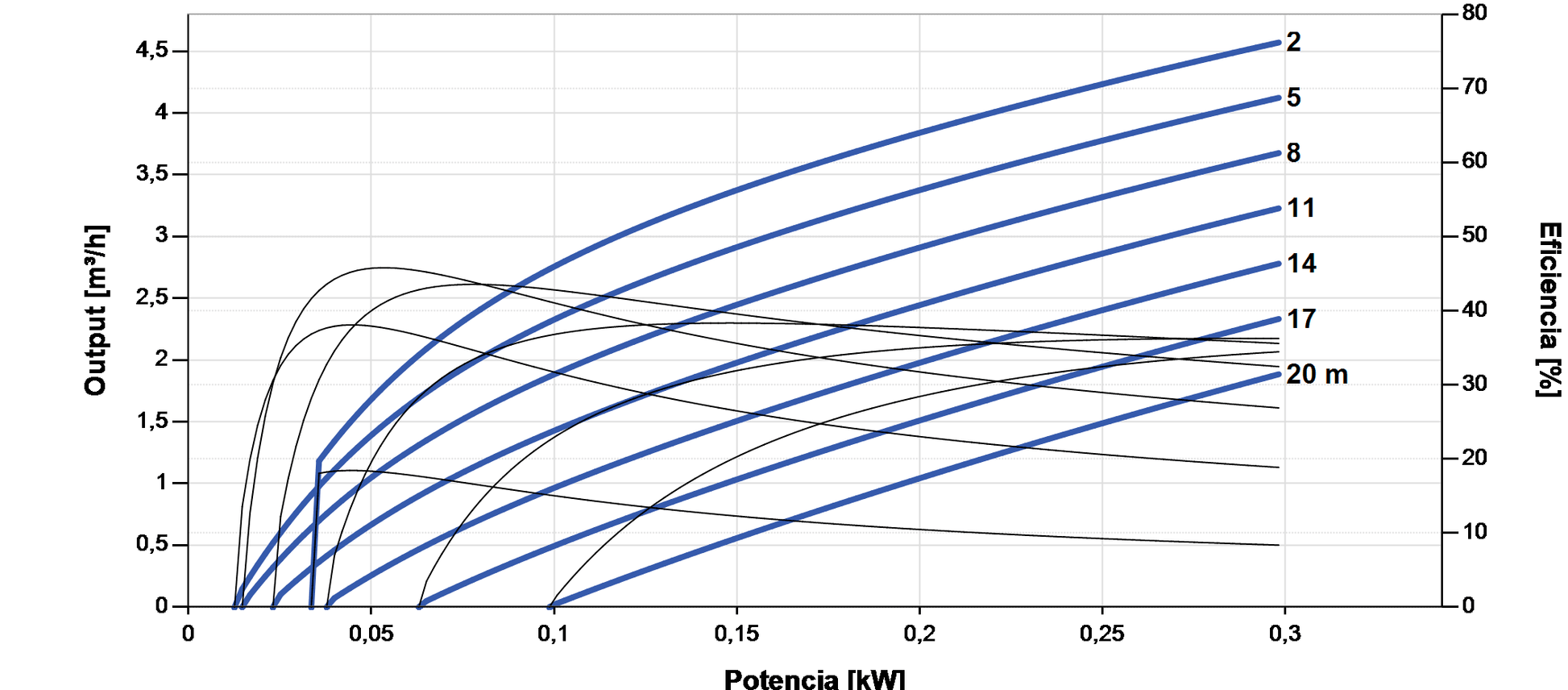 - Referenzleistung: 4,6 m³/h Durchfluss und 20 m Förderhöhe (4"-Brunnen).