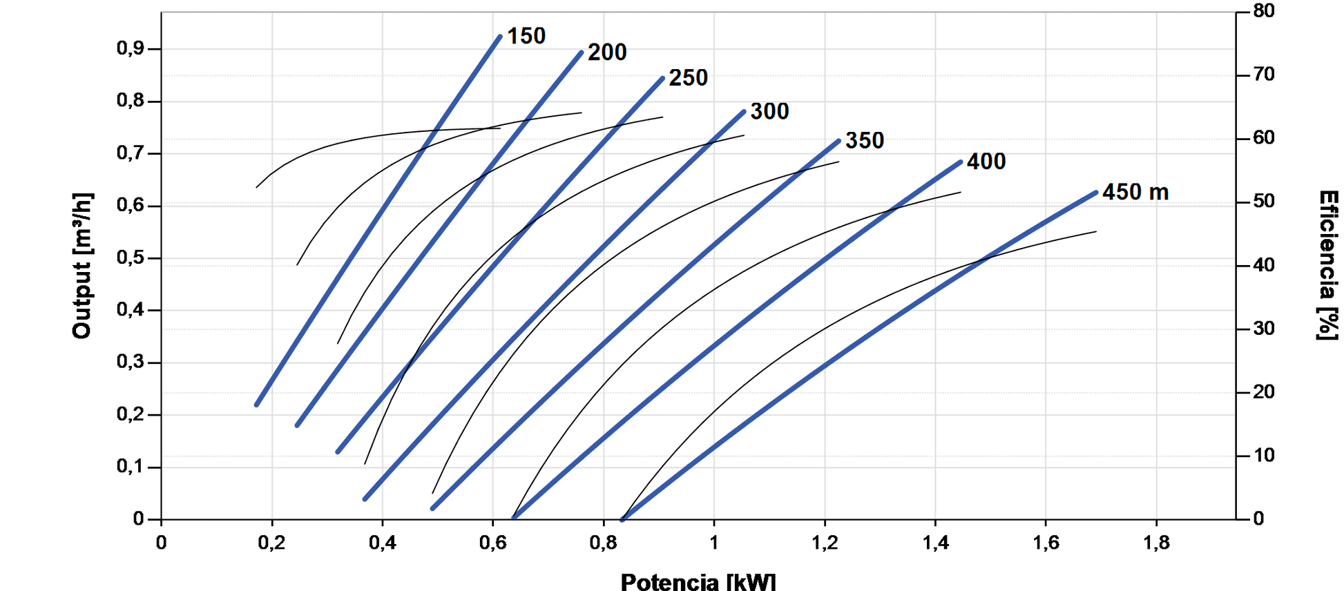 - Systemleistung: 0,92 m³/h Durchfluss und 450 m maximale Förderhöhe bei sauberem Wasser.