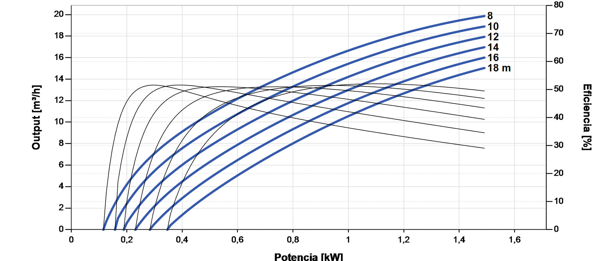 - Max. flow 20 m³/h and max. head 18 m (4" wells).