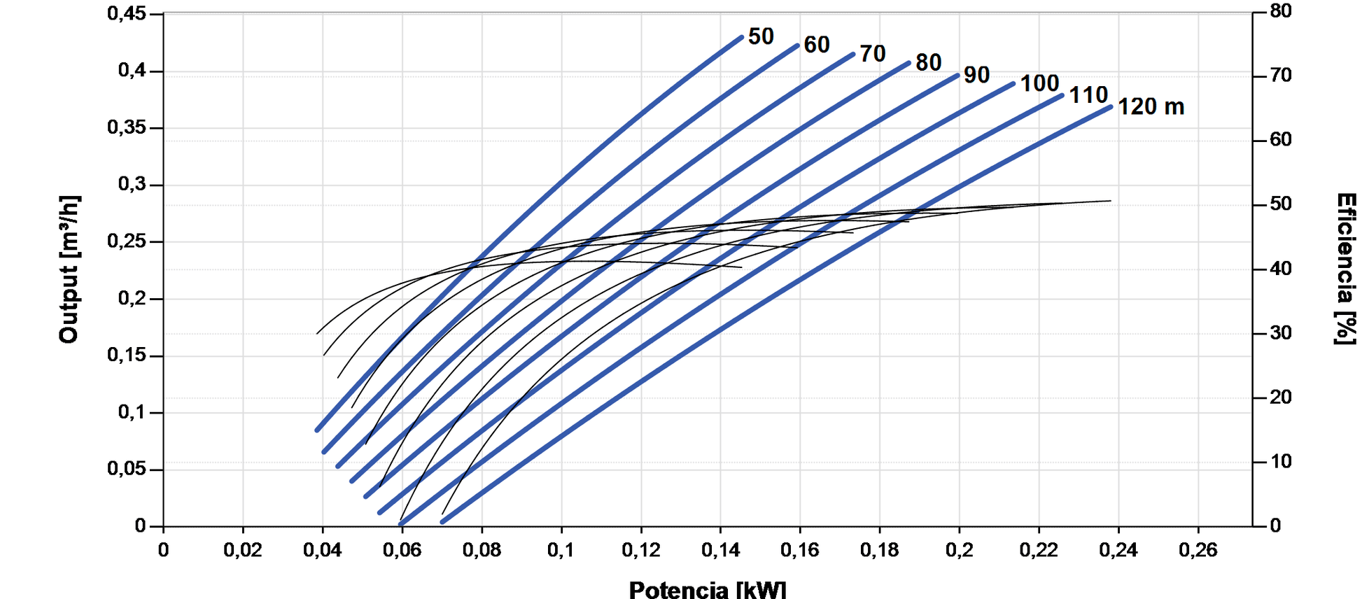 - Reference head 120 m and flow rate up to 0.43 m³/h (high pressure with moderate flow).