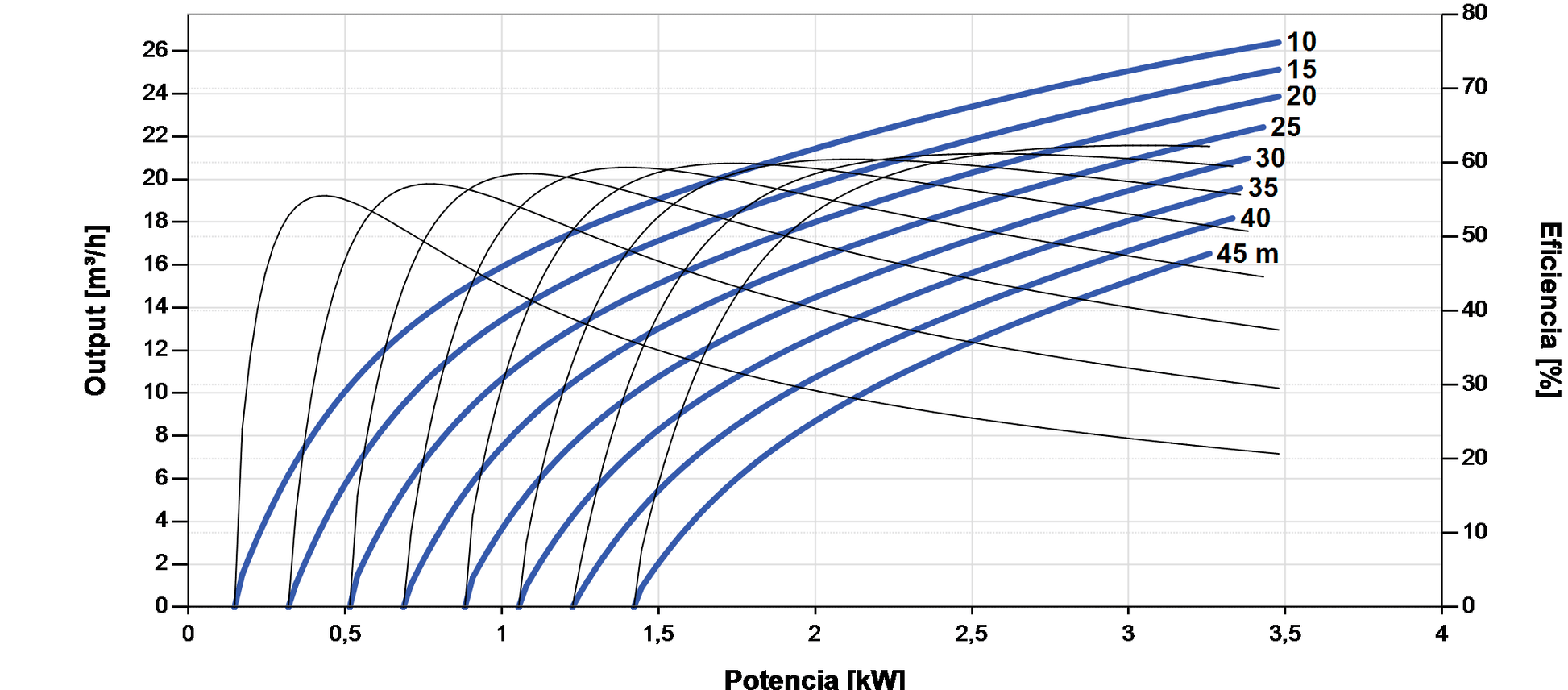 - Maximum flow rate: 26 m³/h and maximum head: 45 m.