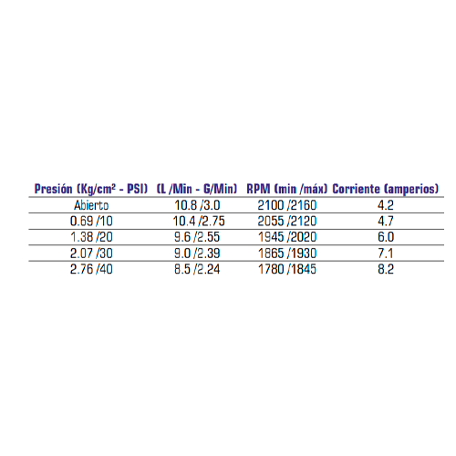 | Consumo típico | ≈ 4–10 A según presión/caudal |