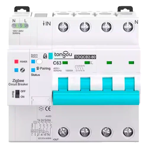 O Magnetotérmico Inteligente Tongou 4P TOQCB2-80 1-63A Curva C Zigbee reúne proteção de 4 polos, medição trifásica e domótica avançada para quadros profissionais, maximizando segurança e eficiência.